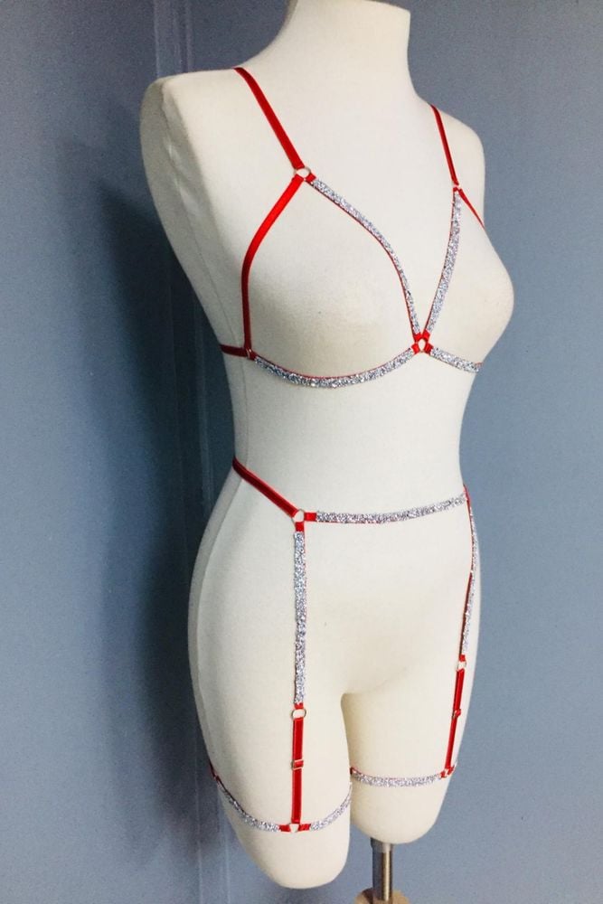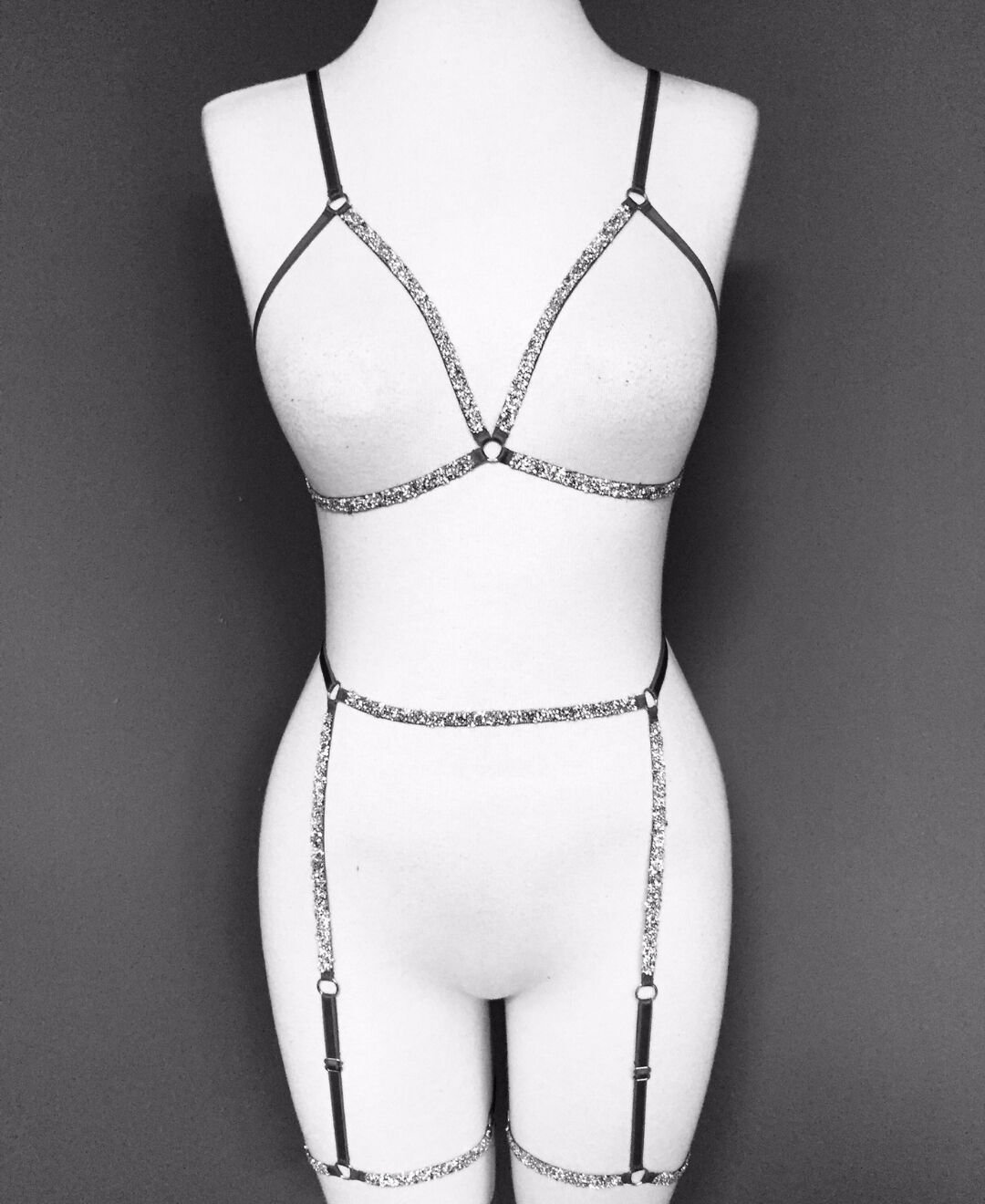 Ashlee Kadın Parlak Taşlı Bacak Aksesuarlı Jartiyer Sütyen Seksi Harness Takım Siyah - XL