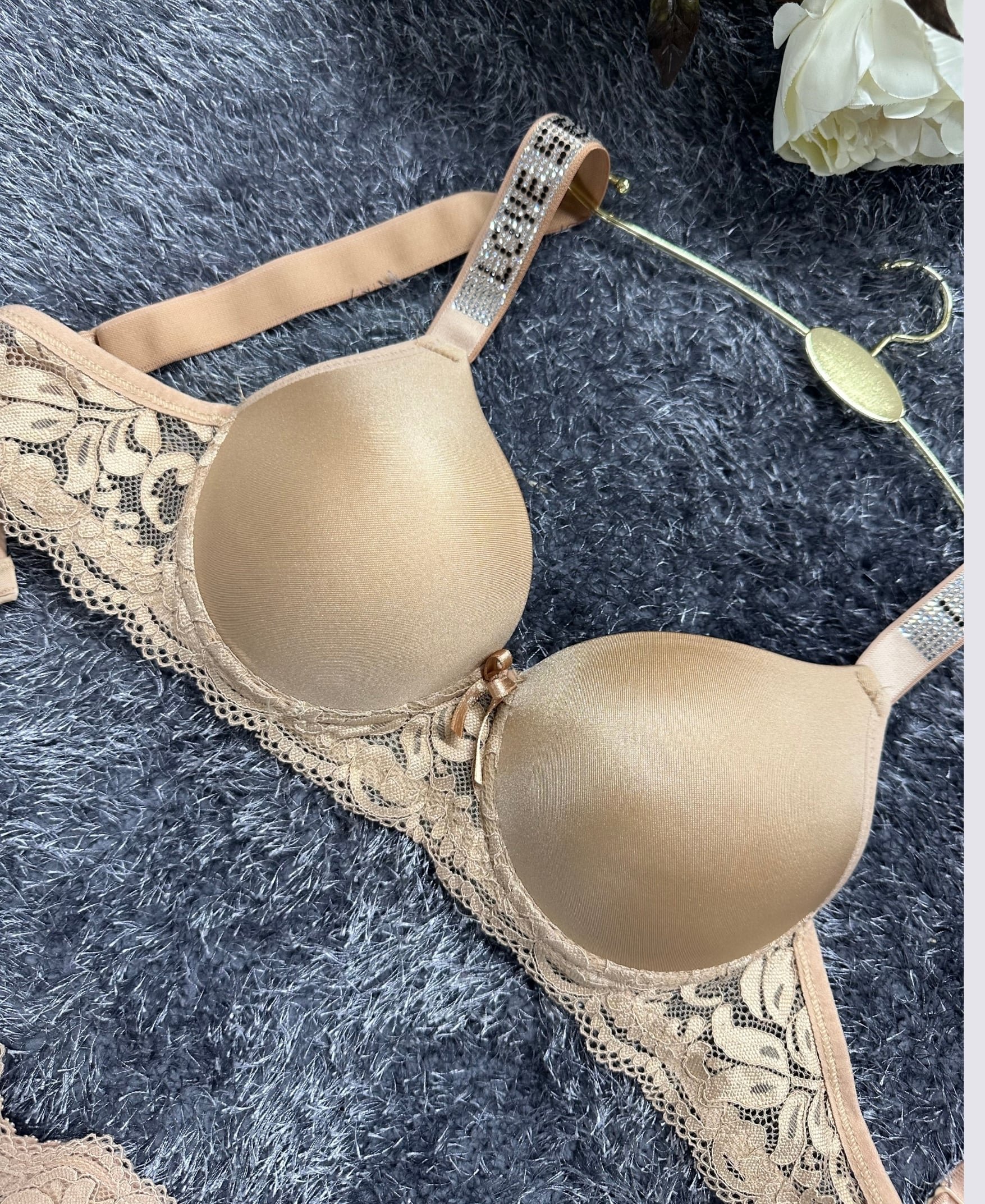 Askıları Parlak Taşlı Dantel Detaylı Push-up Sütyen Takım-315 Bej - 85B