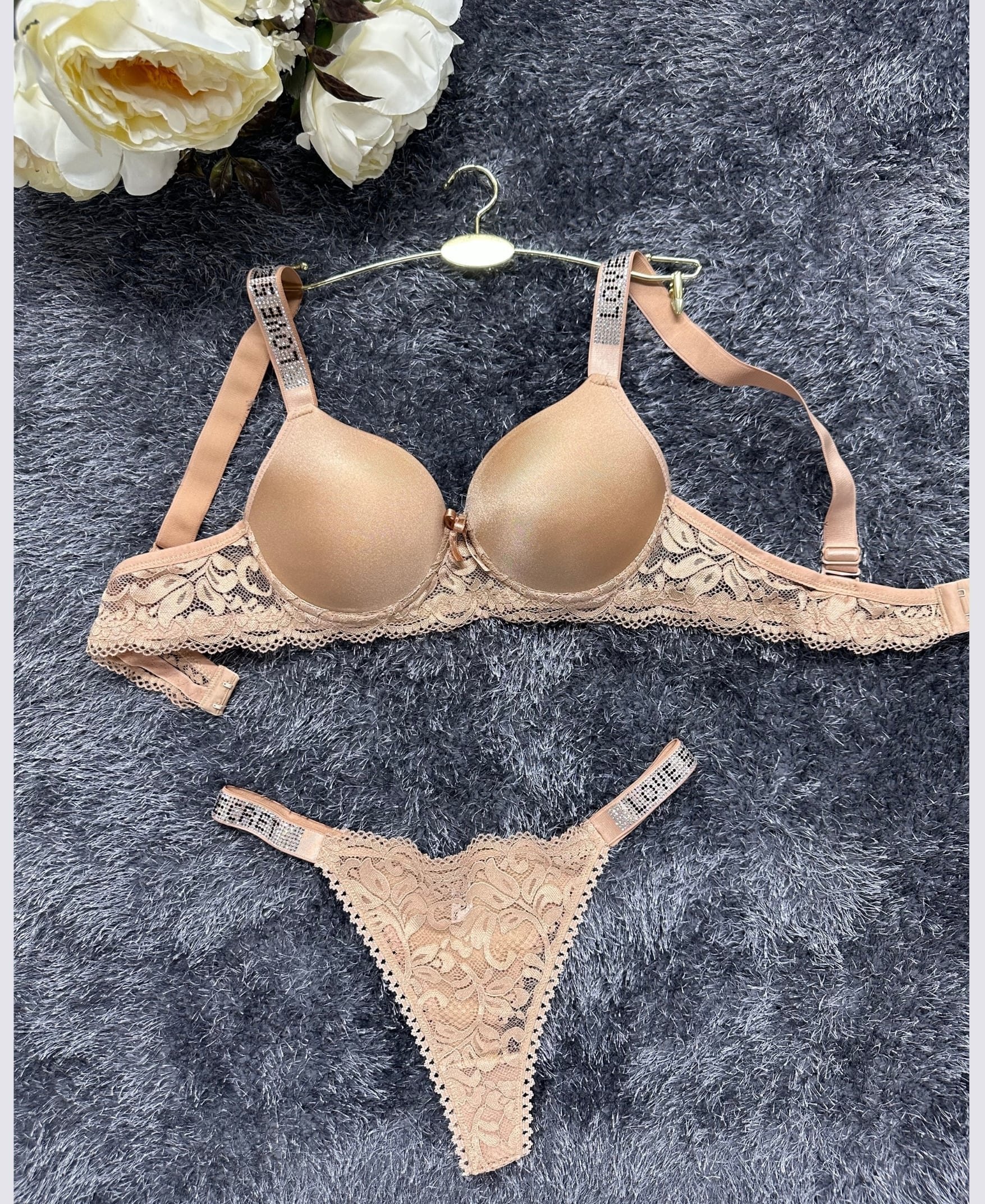 Askıları Parlak Taşlı Dantel Detaylı Push-up Sütyen Takım-315 Bej - 90B