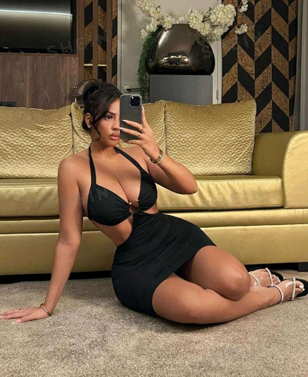 Beleng Kadın Siyah Derin V Dekolte Halka Detaylı Boyundan Bağlamalı Fantezi Gecelik -7710