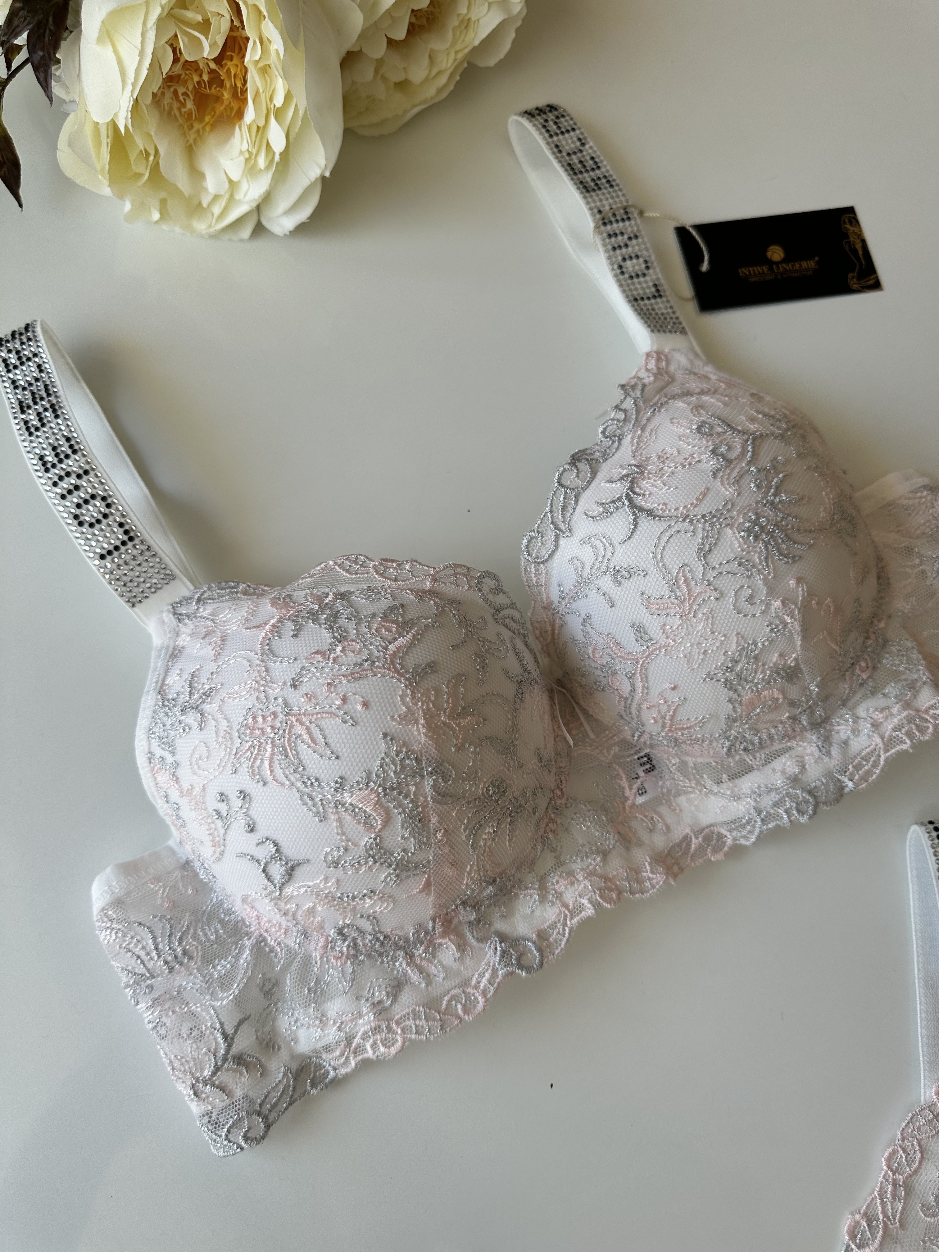 Desenli Push-up Askıları Taşlı Sütyen Takım Pembe - 80B