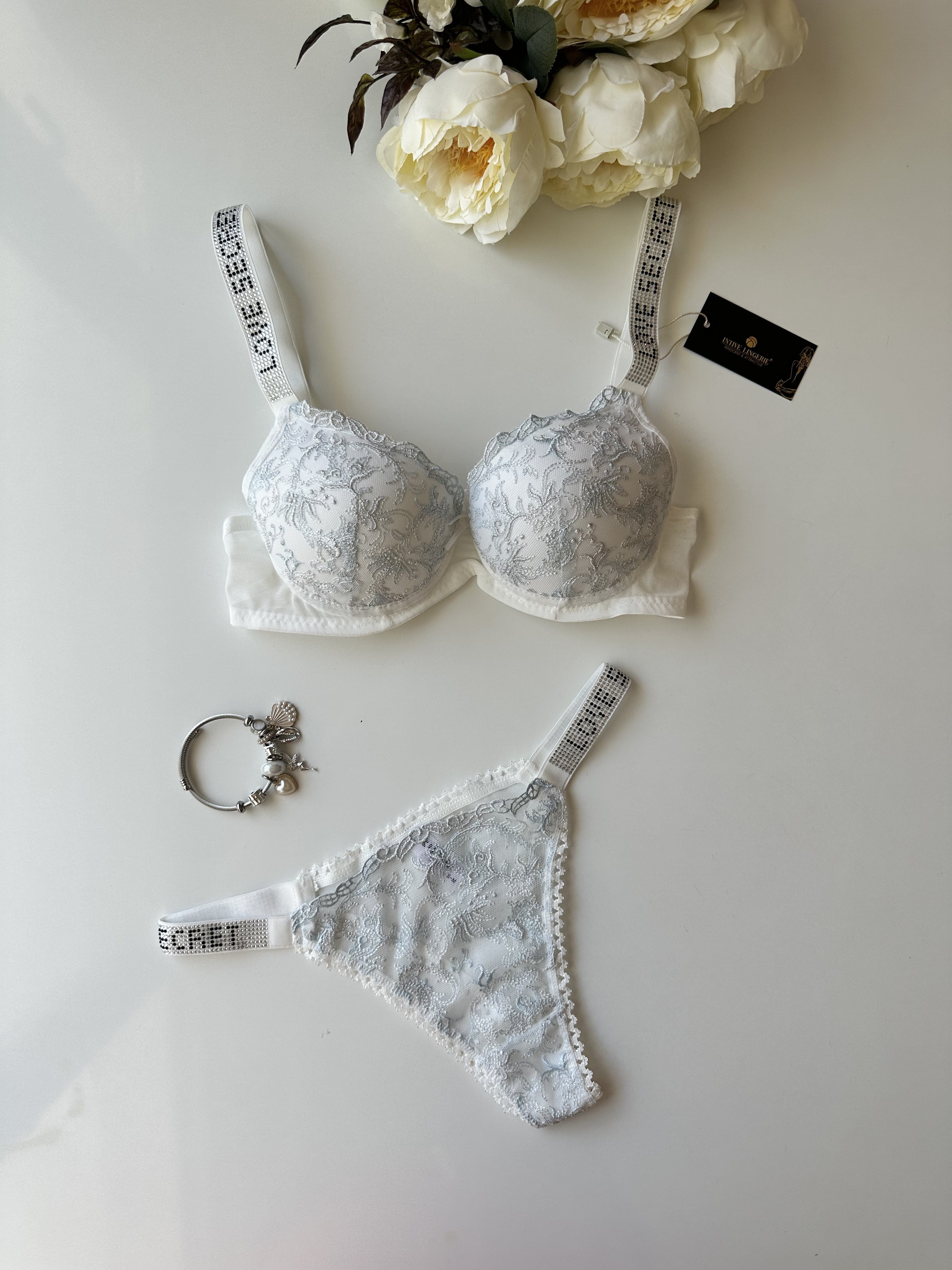 Desenli Push-up Askıları Taşlı Sütyen Takım Mavi - 80B