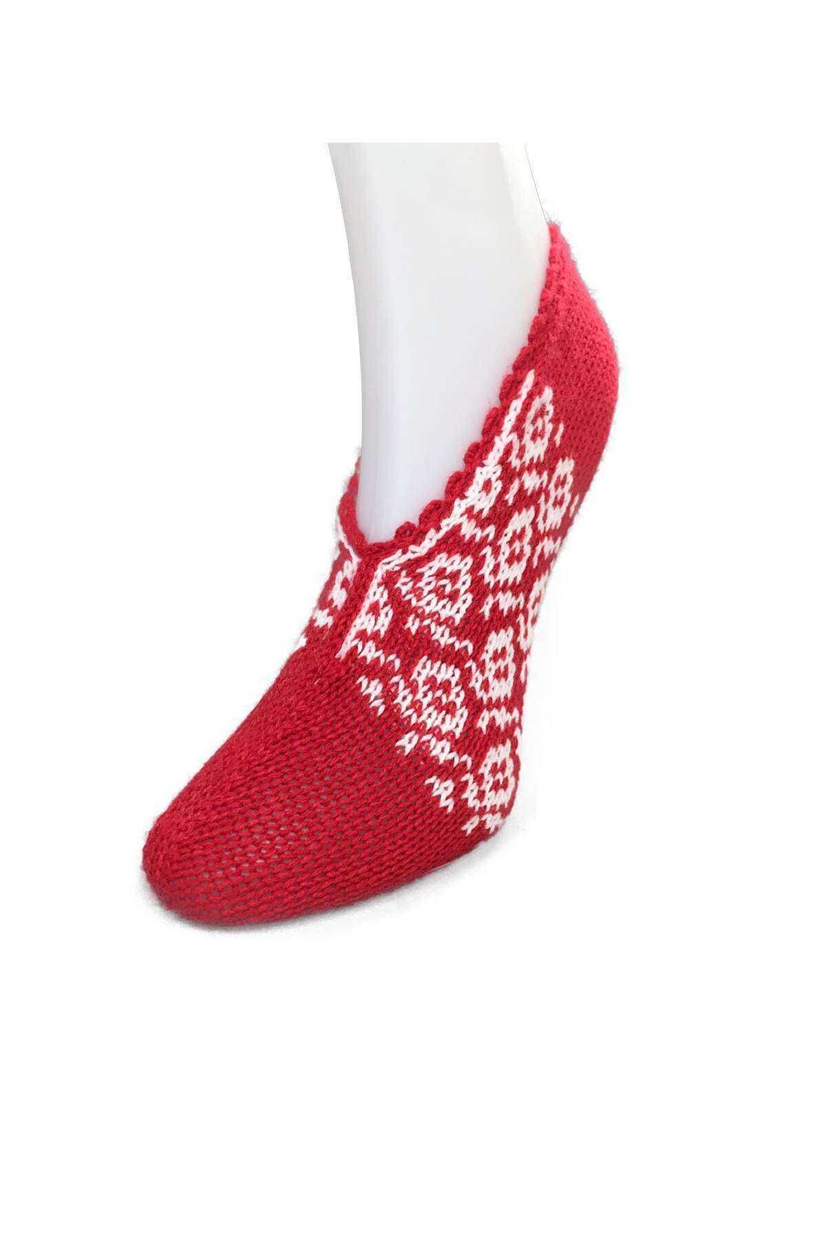 El Örgüsü Kışlık Şık Kadın Yün Patik Desenli Kırmızı 36-40