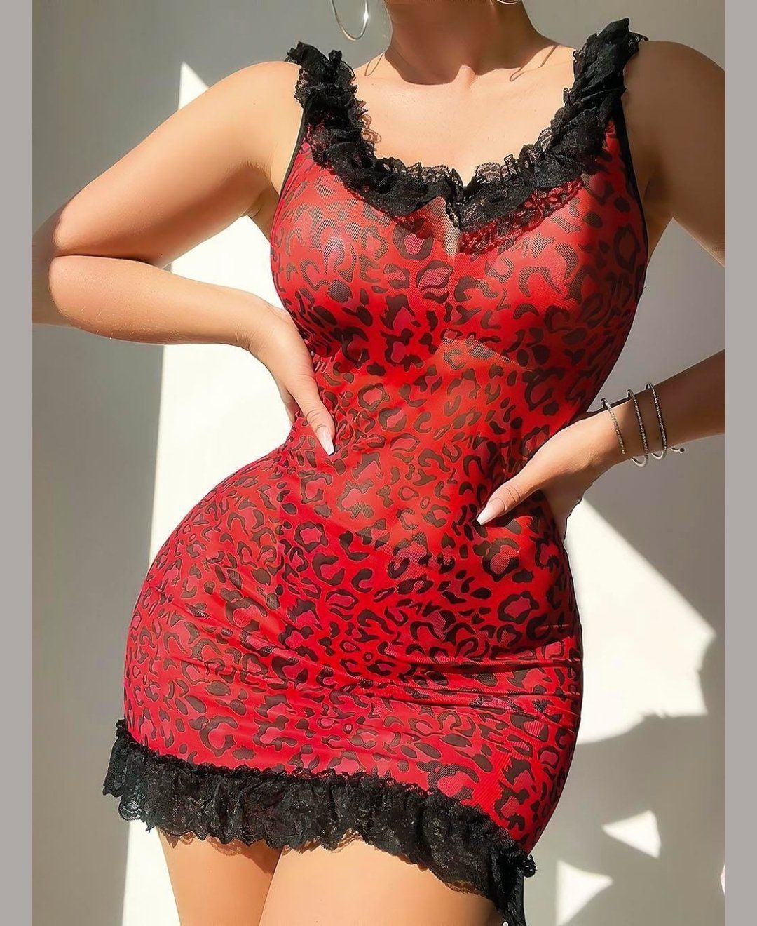 İntive Arkası Tamamen Açık Bağlamalı Leopar Desen Kırmızı/Siyah Tasarım Gecelik