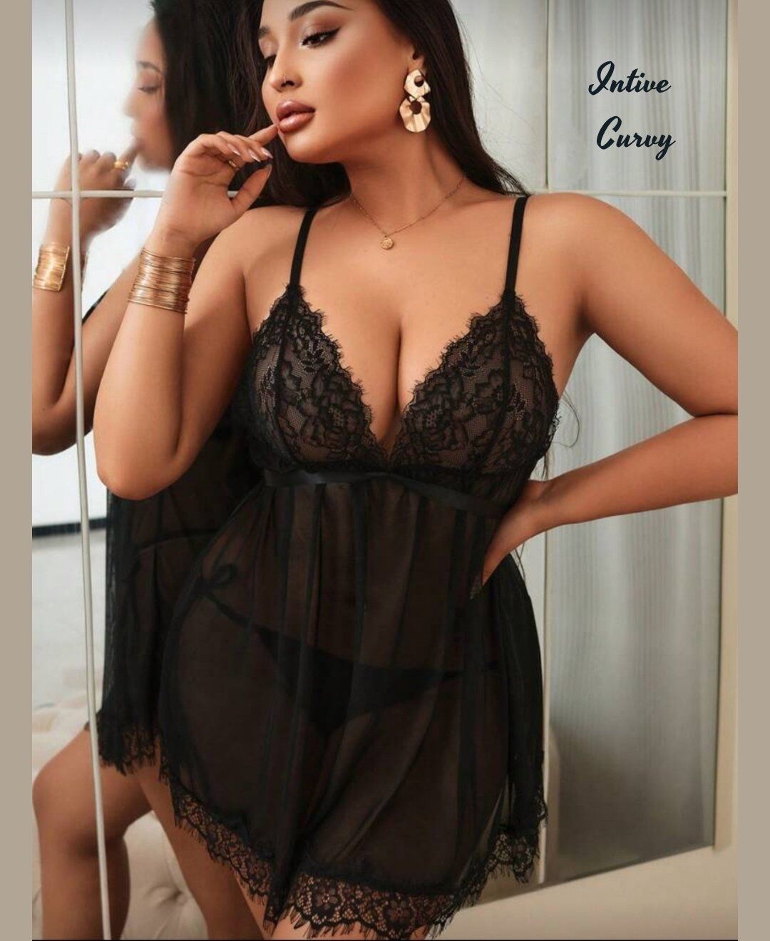 Intive Curvy Siyah V Yaka Dekolteli Saten Kuşaklı Transparan Dantel Detaylı Büyük Beden Gecelik Siyah - 3XL/4XL