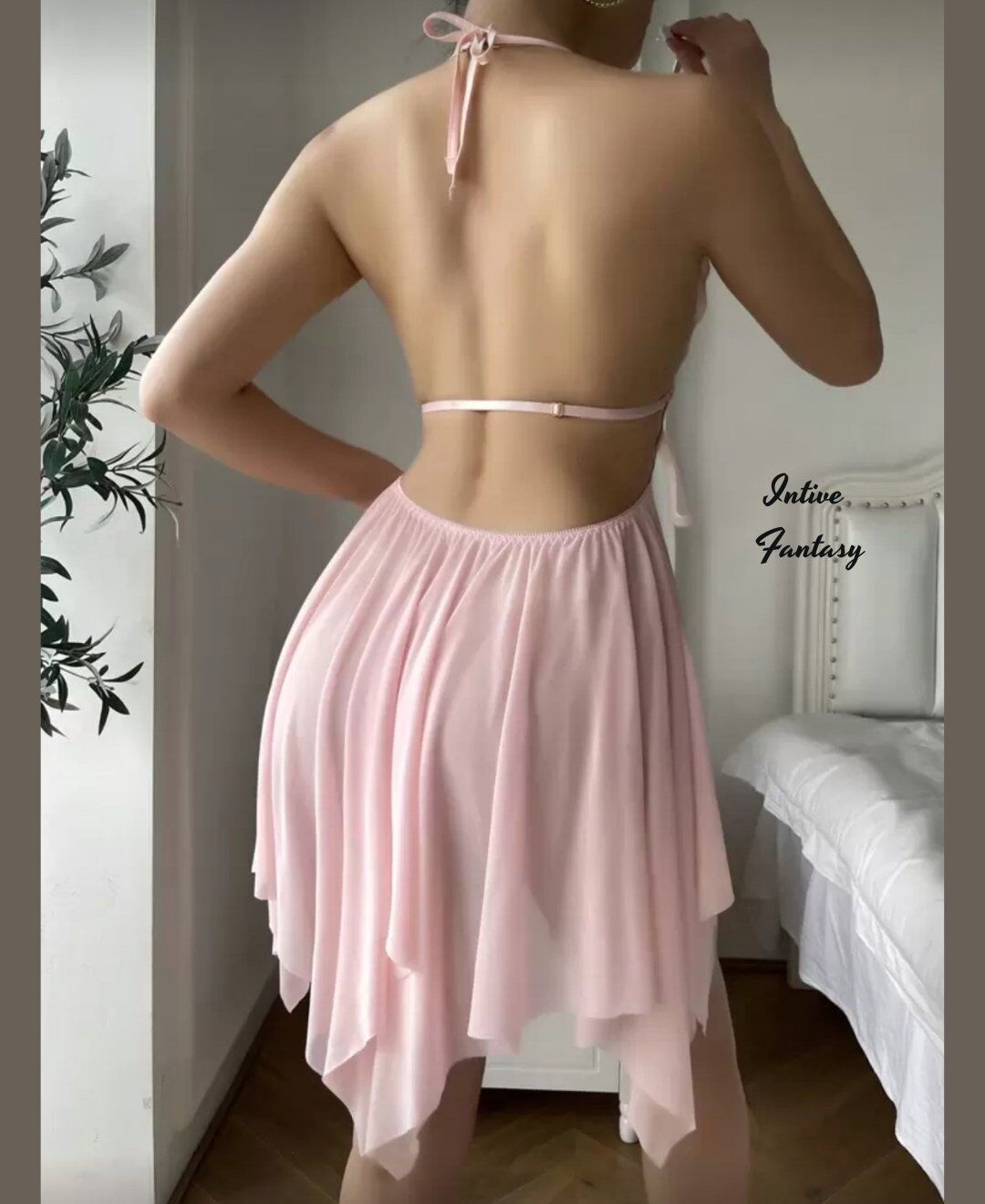 Intive Fantasy Göğsü Kelebek Kalıplı Asimetrik Tüllü Transparan Tasarım Pembe Mini Gecelik Pembe - L/XL