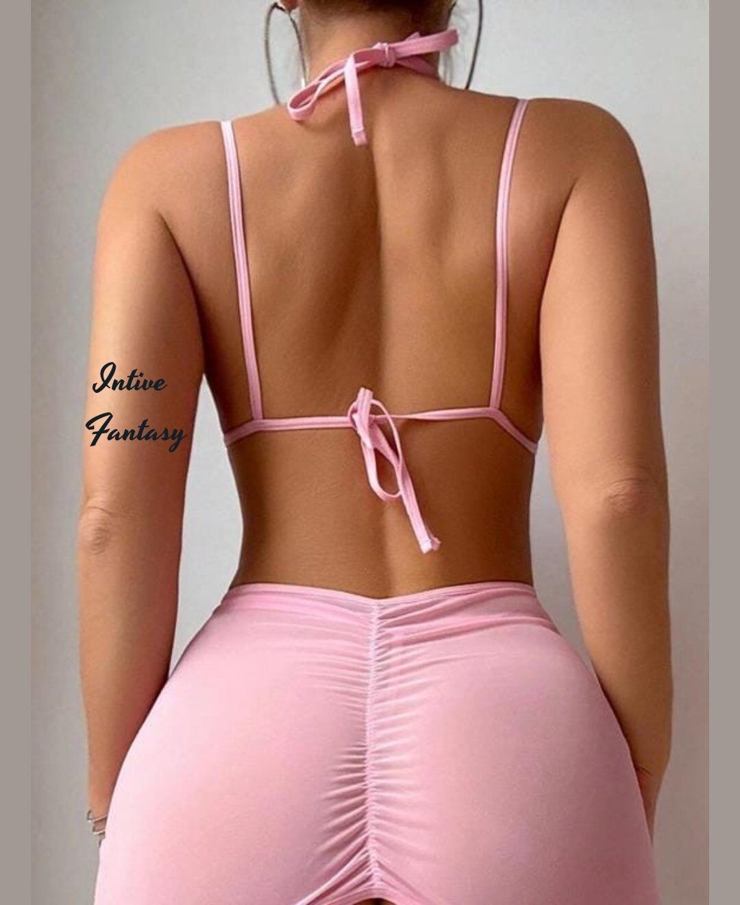 Intive Fantasy Toz Pembe Boyundan Bağlamalı Bel Dekolteli V Yaka Mini Gecelik Pembe - L/XL