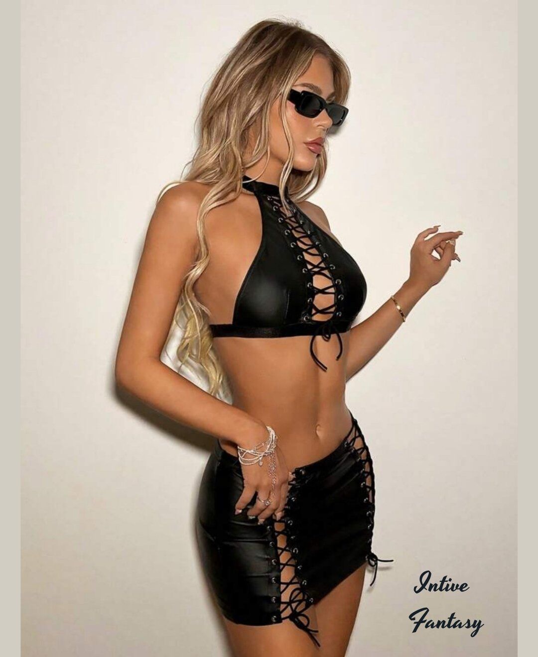 Intive Fantasy Wrap Kesim Büstiyer ve Eteği Bağlama Detaylı Siyah Büstiyer Etek Takım Siyah - S/M
