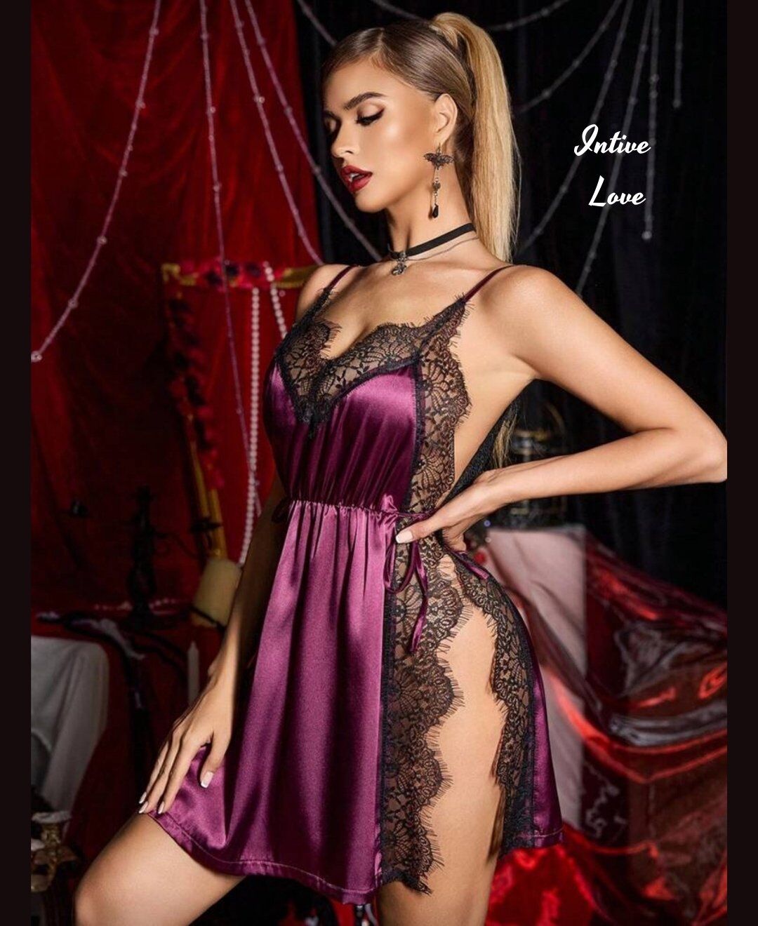 Intive Koyu Mor Siyah Dantel Detaylı Yandan Bağcıklı Yırtmaçlı Fantezi Gecelik Mor - L/XL