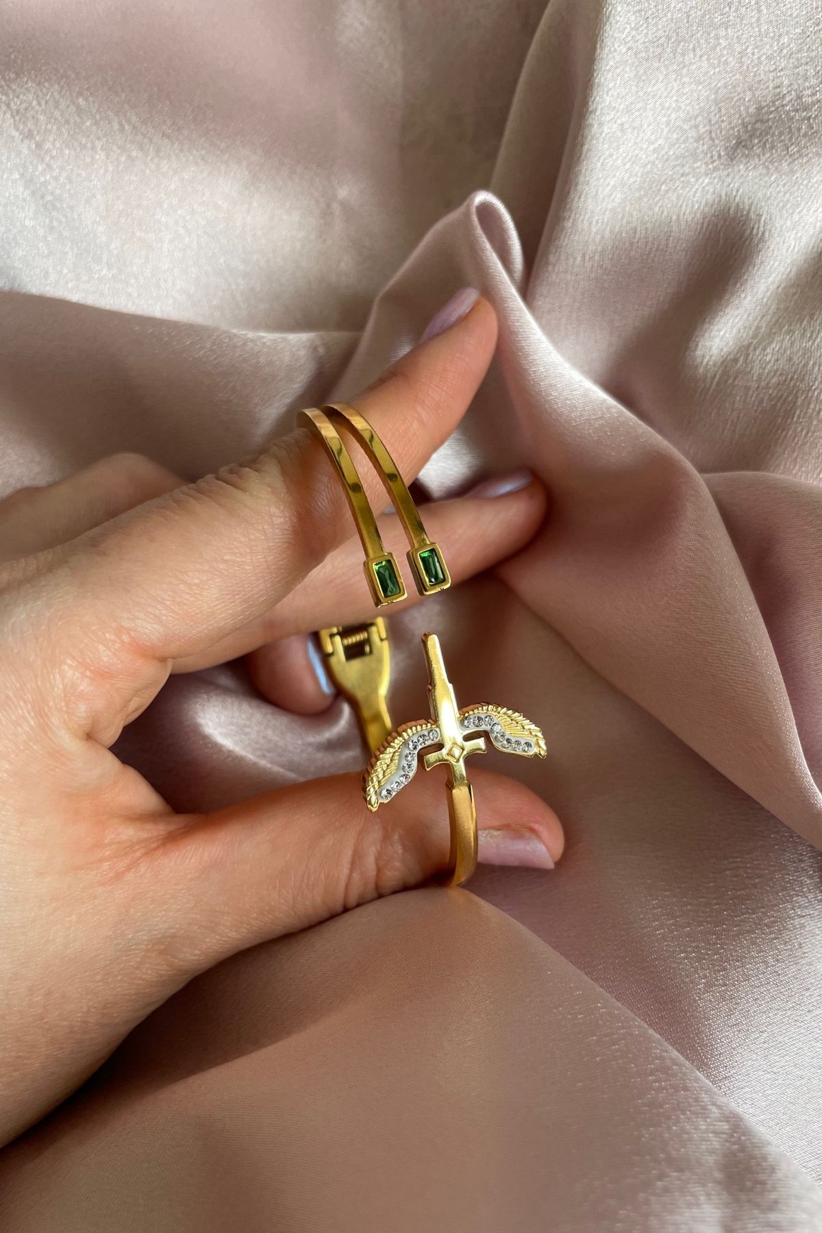 Kadın 316L Çelik Yeşil Taş Detaylı Mikail Kanat Figürlü Kelepçe (Kararma-solma yapmaz)