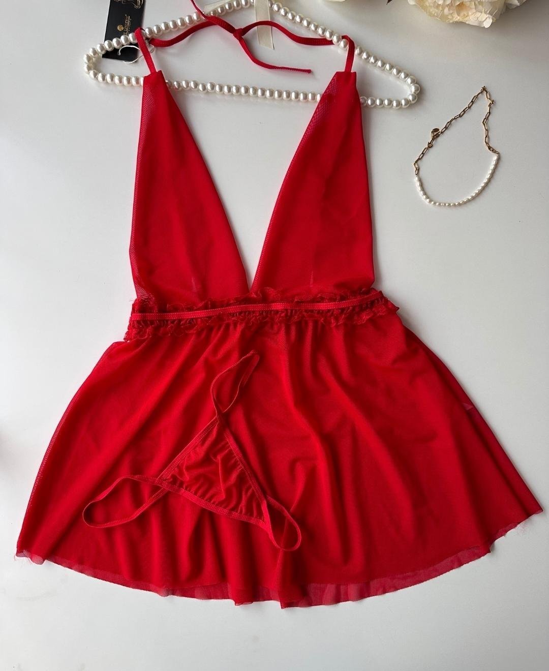 Kadın Boyundan Bağlamalı Derin Dekolte Tül Mini Gecelik/Babydoll Kırmızı - S/M