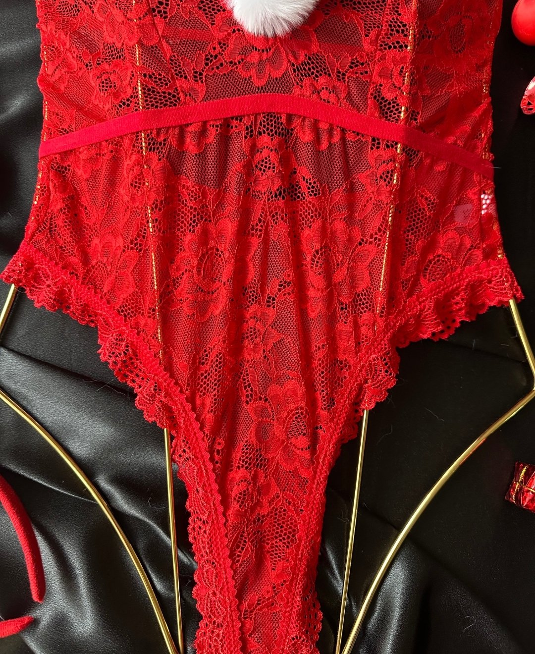 Kadın Yılbaşı Özel Göğsü Beyaz Tüy Detaylı Dantelli Kırmızı Büstiyer -3630 Kırmızı - L/XL