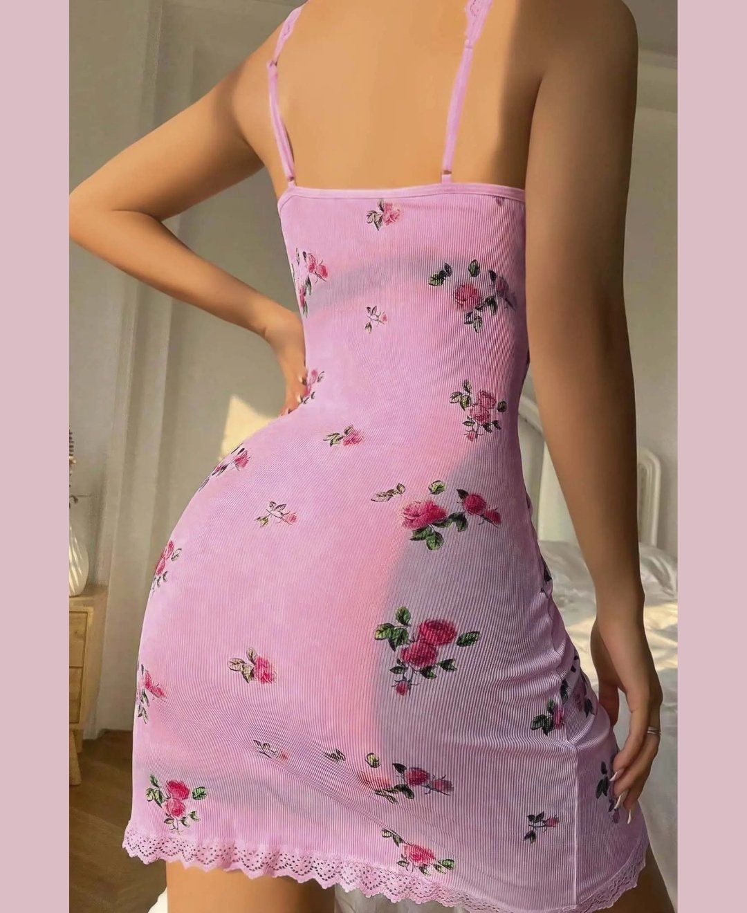 Lily Bianca %100 Pamuk Penye Kalp Çiçek Desenli Derin V Kalp Aksesuarlı Gecelik-13005 Pembe - L/XL