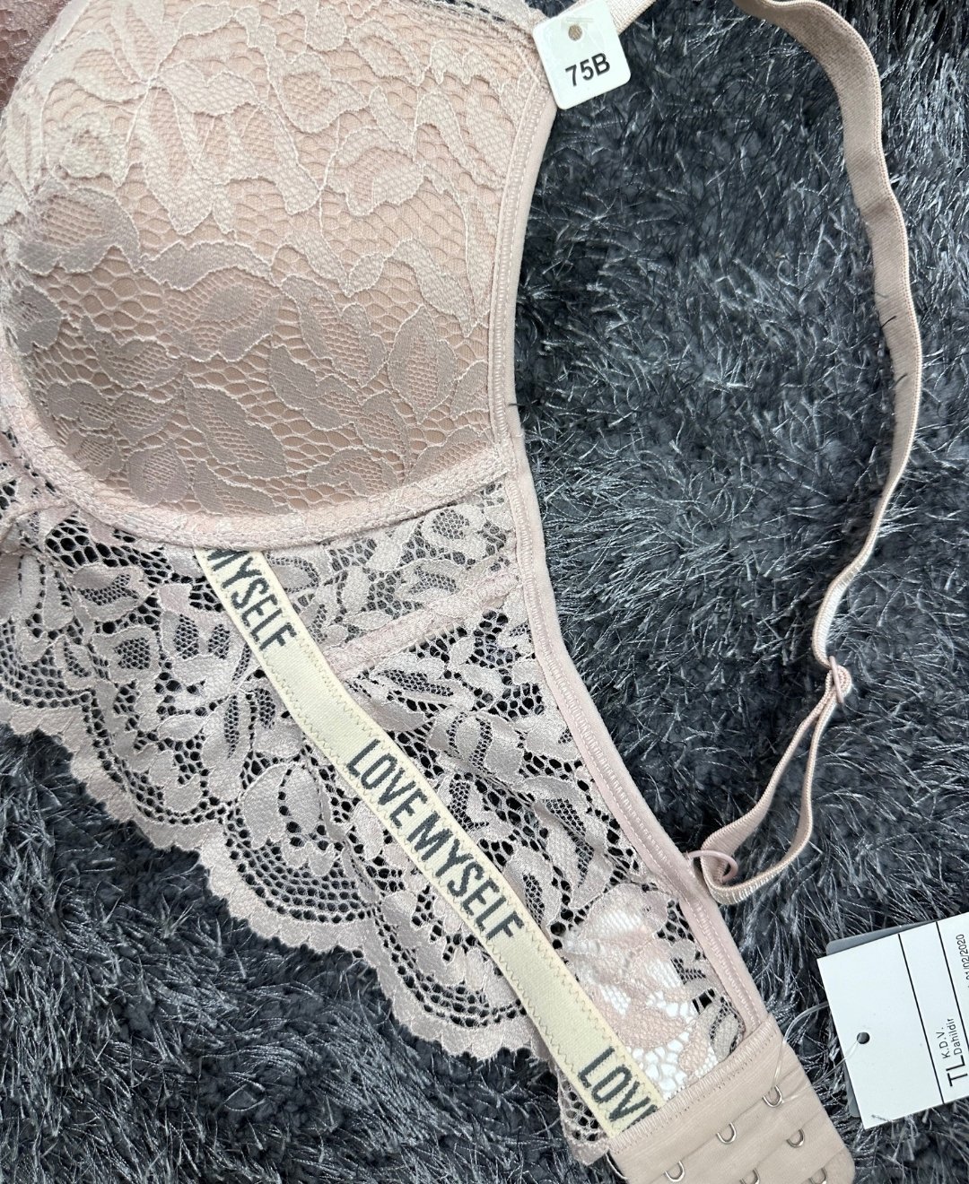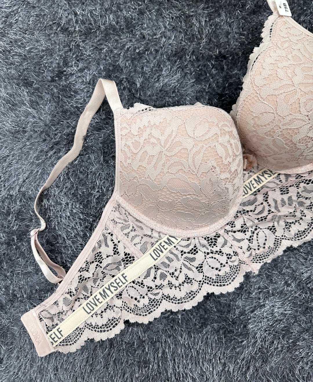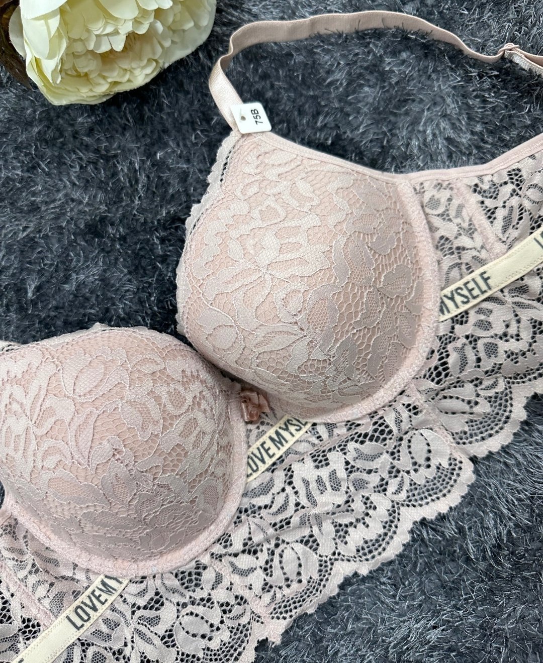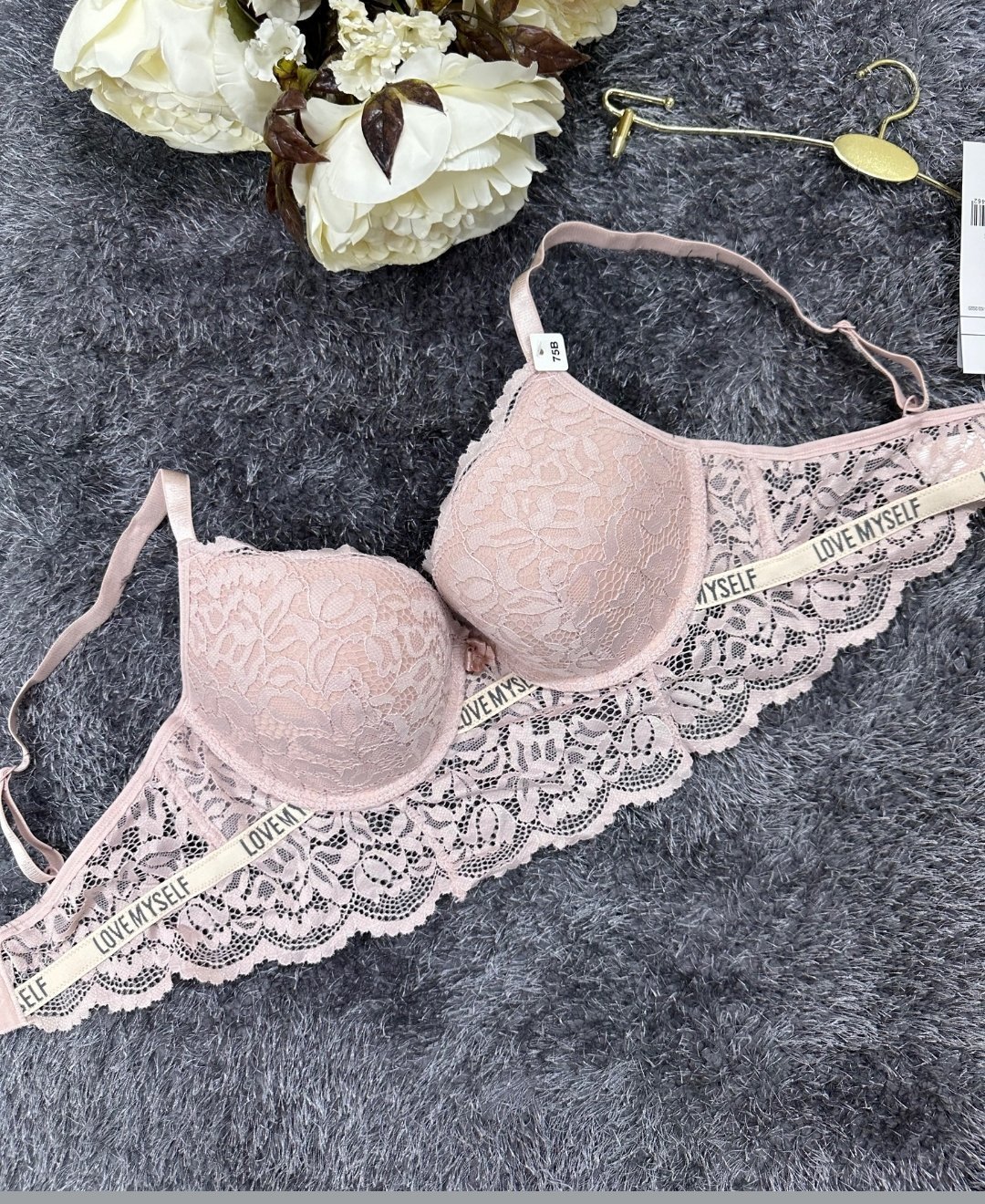 -Love myself- Yazılı Balenli Sakallı Dantel Hafif Destekli B-C Cup Uyumlu Sütyen Pudra - 80B