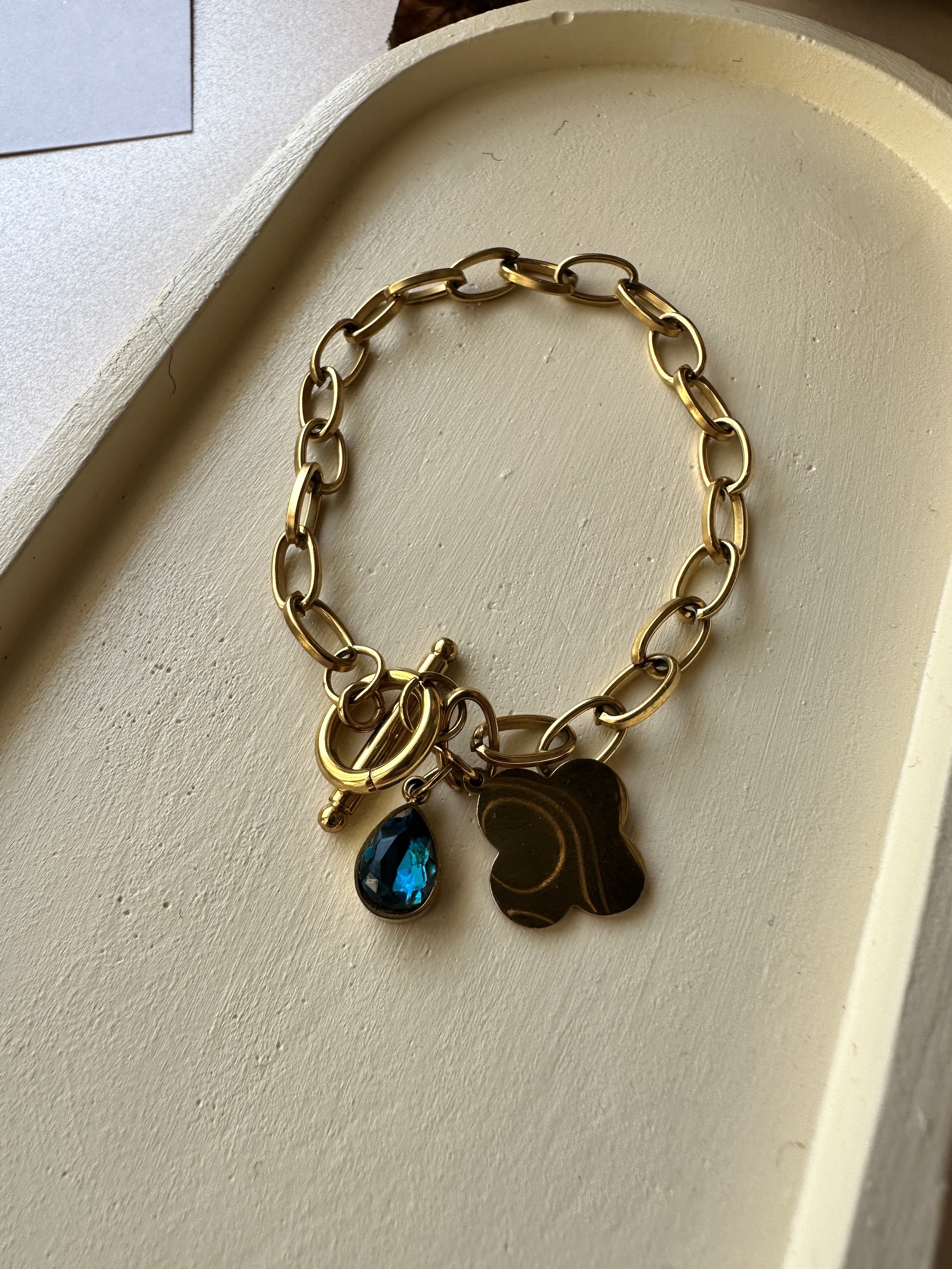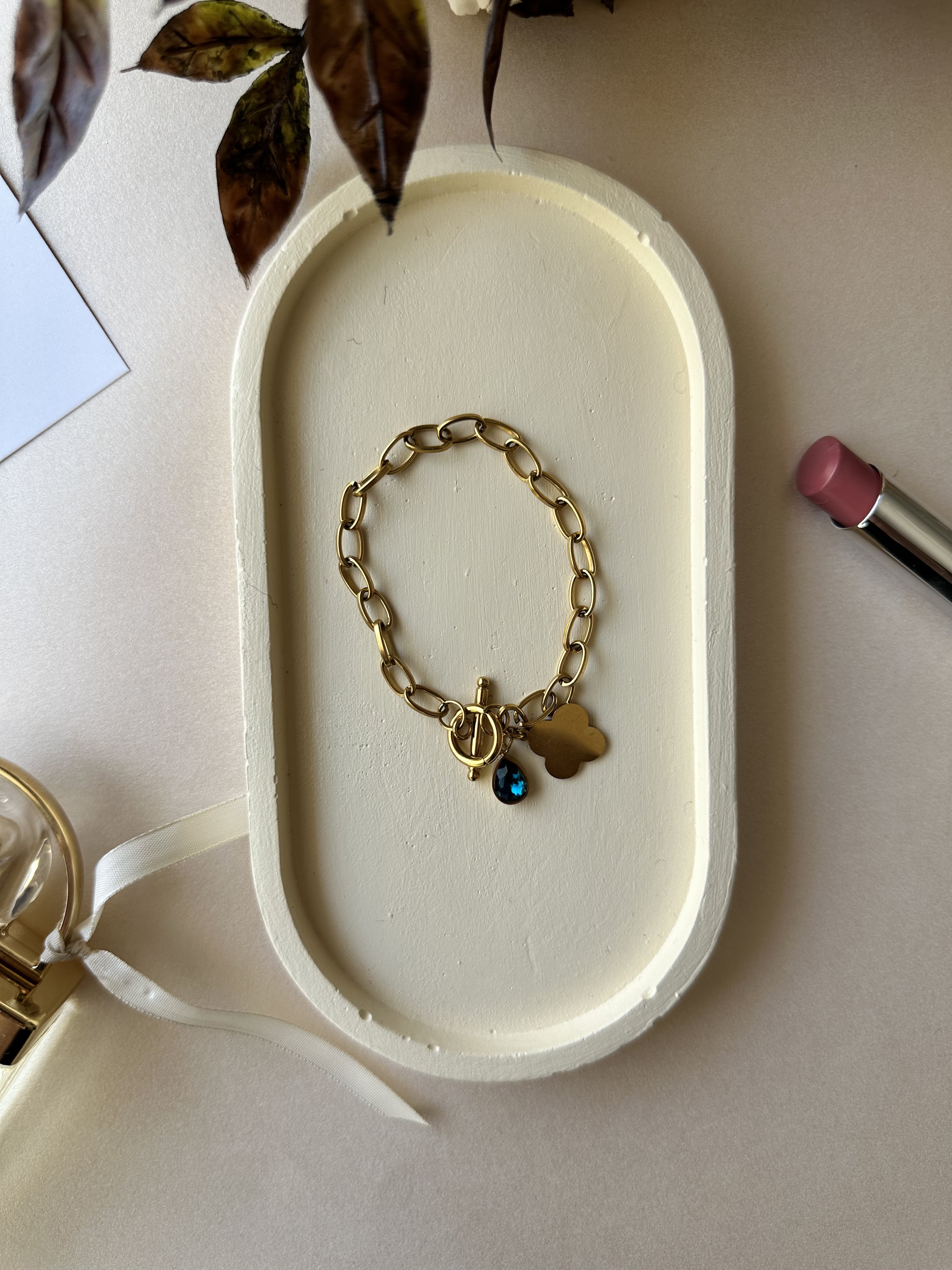 Mavi Taş ve Yonca Detaylı Zincir Çelik Bileklik