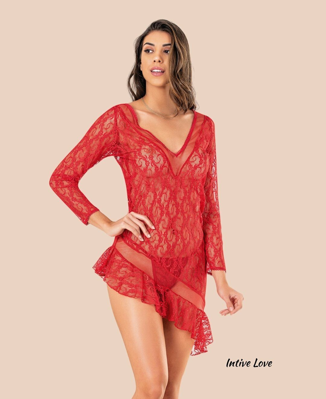 Moongirl Asimetrik Kesim Transparan Full Dantelli Uzun Kollu Mini Gecelik/Babydoll Kırmızı - XL