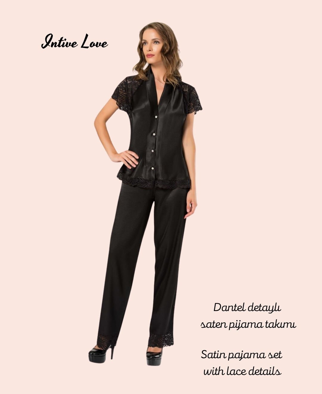 Moongirl Siyah Derin V Dekolte Dantel Detaylı Uzun Kollu Saten Pijama Takımı