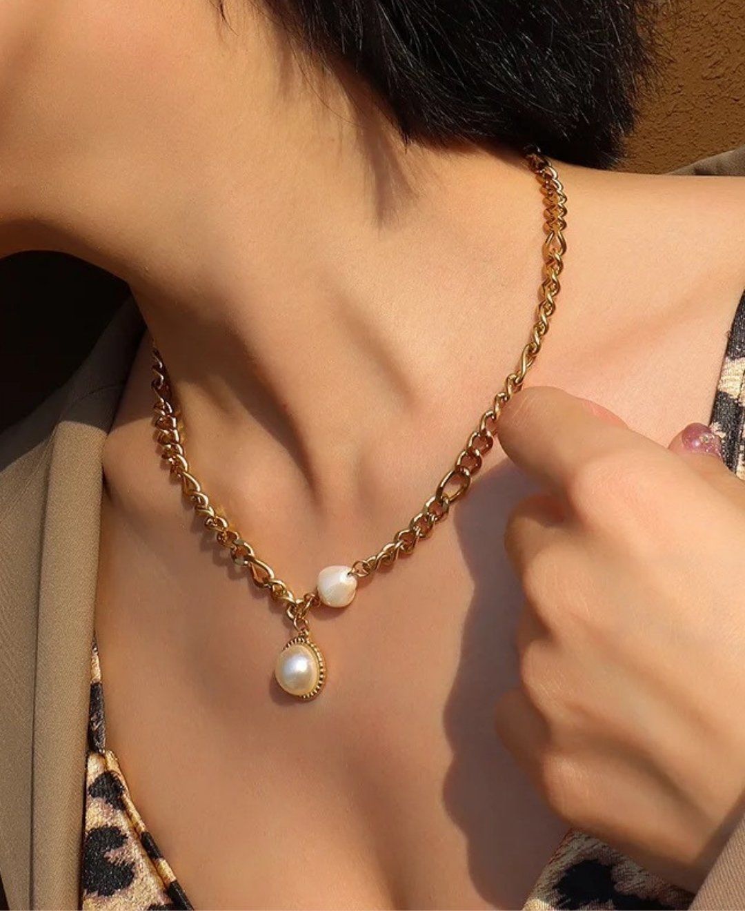 MurayShine Barok İncili Paslanmaz Çelik Zincirli Modern Kolye