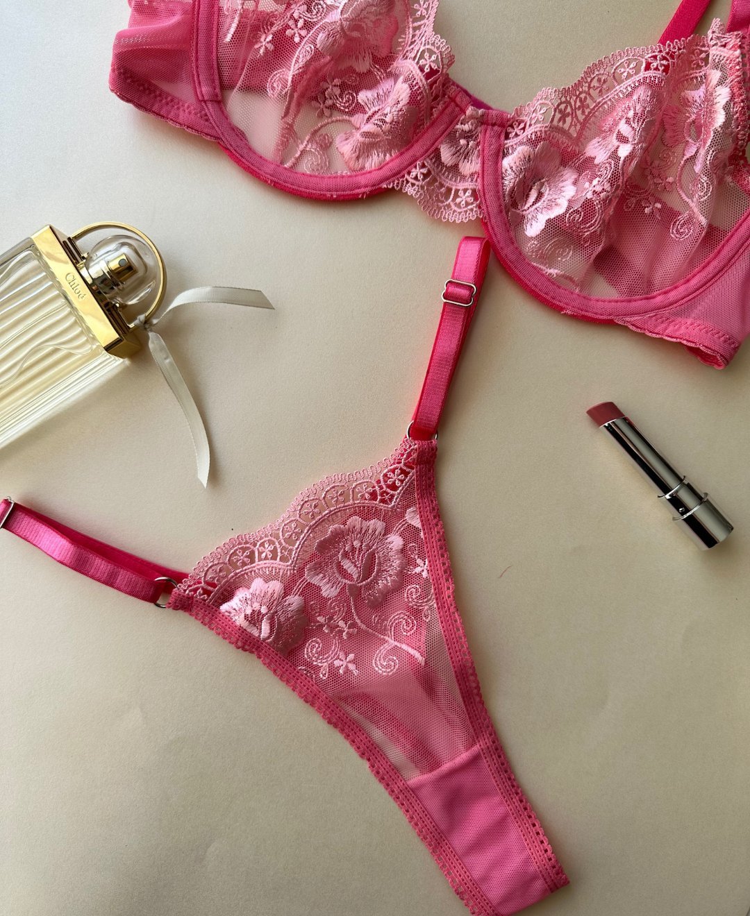 Pinky Flower Balenli Pembe Çiçek Desenli Seksi Sütyen Tanga Takım Pembe - 75