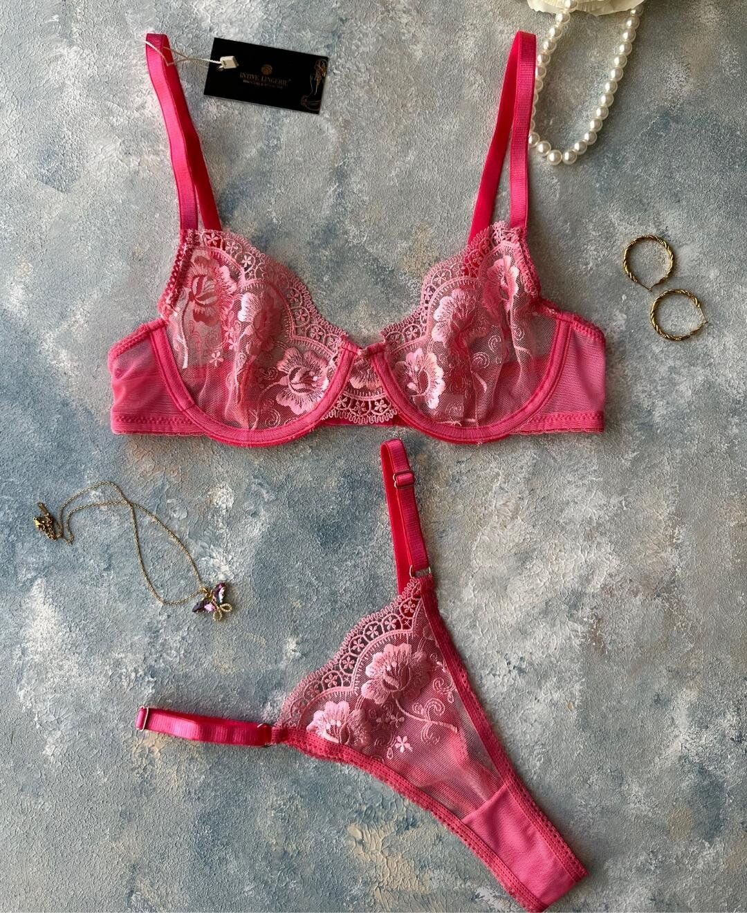 Pinky Flower Balenli Transparan Pembe Parlak Çiçek Desenli Sütyen Tanga Takım Pembe - 75